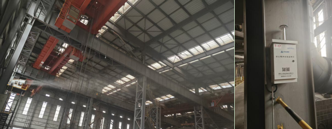 根據(jù)現(xiàn)場踏勘情況,針對廢鋼水平加料車間料棚內(nèi)部產(chǎn)塵行為,實(shí)施了全覆蓋抑塵治理,有效遏制生產(chǎn)過程中揚(yáng)塵擴(kuò)散。在電爐水平加料段,部署超細(xì)霧炮與AI攝像裝置,結(jié)合“AI視覺粉塵識別系統(tǒng)”,實(shí)現(xiàn)了對區(qū)域內(nèi)粉塵濃度的實(shí)時(shí)識別、智能分析與精準(zhǔn)定位。