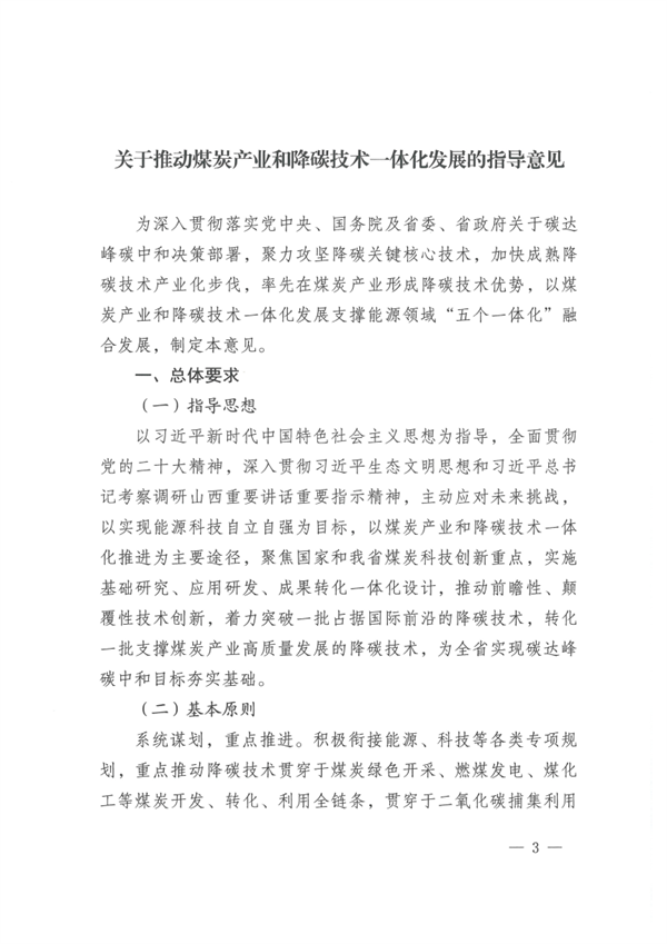 山西:《關(guān)于推動(dòng)煤炭產(chǎn)業(yè)和降碳技術(shù)一體化發(fā)展的指導(dǎo)意見(jiàn)》