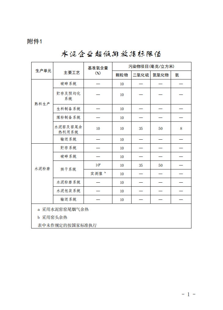 (一)有組織排放控制指標。在基準氧含量10%的條件下,水泥窯及窯尾余熱利用系統(tǒng)煙氣顆粒物、二氧化硫、氮氧化物排放濃度小時均值分別不高于10、35、50mg/m3,氨排放濃度小時均值不高于8mg/m3(其他有組織排放指標詳見附件1)。脫硝氨水消耗量小于4kg/t熟料(基于20%的氨水濃度折算)。達到超低排放的水泥企業(yè)每月至少95%以上時段小時均值排放濃度滿足上述要求。